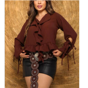 Os babados dominaram a inspiração barroca! As blusas que vão dominar a tendência adicionam volume e atenção ao visual, enquanto a fluidez e a transparência mantêm o equilíbrio. Experimente com jeans flare ou saias mids para um romantismo sutil. Complete com sandálias delicadas ou botas de cano médio para um toque de elegância.